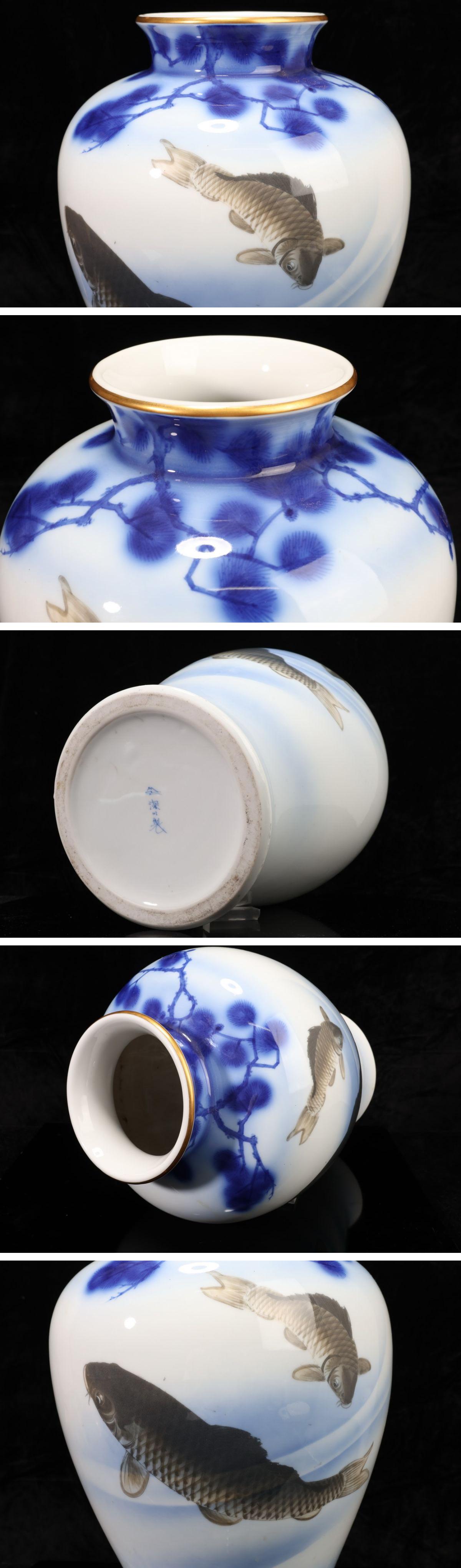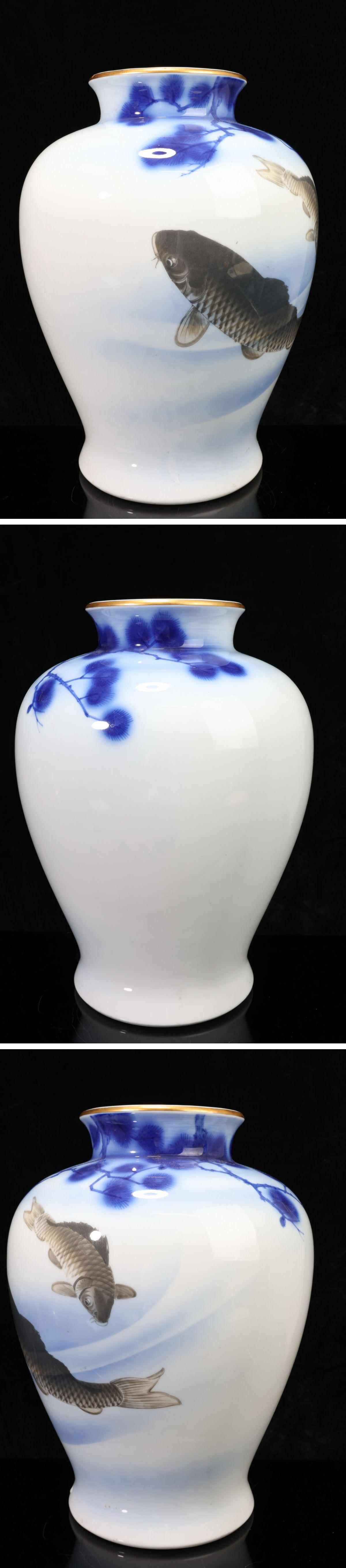 > 【珍品堂】1円から Y63-V05 有田焼 深川製磁 宮内庁御用達 松に双鯉 花瓶 高32cm 飾壺 花器 花入 置物 昭和レトロ 人気アイテム