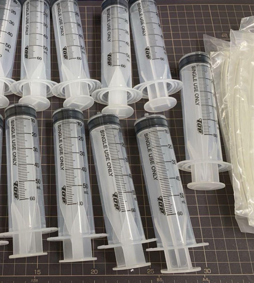 > 美品 TOP社 純正 容量 60ml 注射器 10本セット ノズル(ホース)10本付き シリンジ ポンプ オイル 交換 など 予備品 注入器