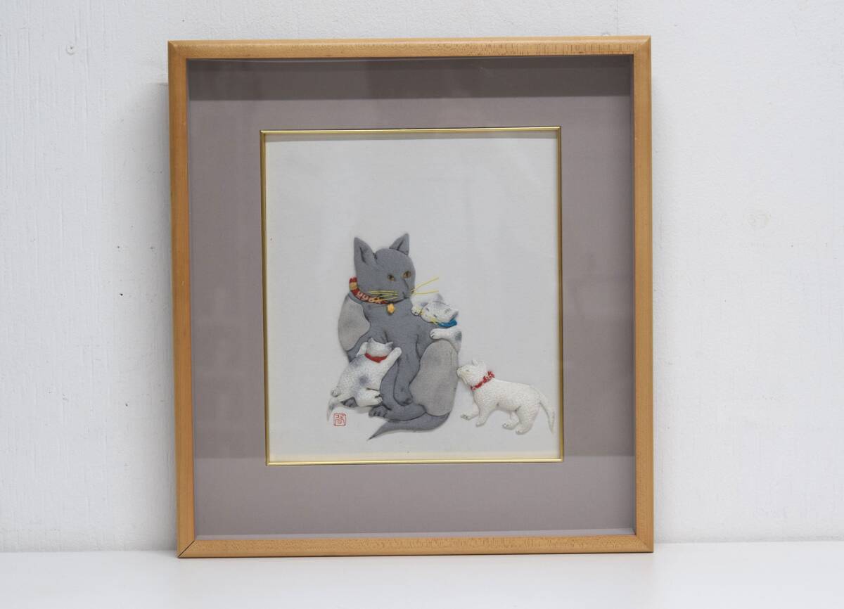 - ■ 縮緬細工 親子猫 色紙額装品 母ねこ、小ねこ 押絵、ちりめん細工 和布 ■