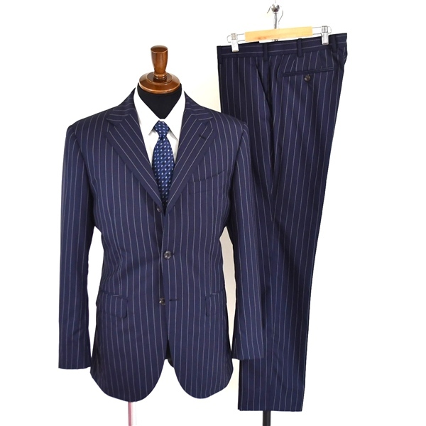 3つボタンシングル。段返り。フラップポケット。サイドベンツ。袖口4つボタン。本切羽。総裏地仕上げ。ネーム刺繍あり。