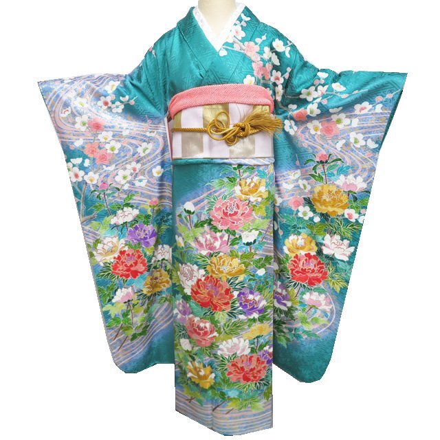 - 振袖 襦袢 2点 セット 着物 中古 金駒刺繍 流水に花の図 牡丹 梅 地模様 緑色 多色 金 身丈156cm 裄65cm M きもの北條 A1276-7