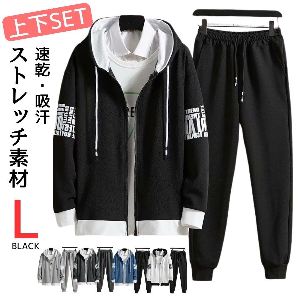 > セットアップ メンズ ジャージ上下 スウェット上下 ルームウェア スポーツウェア 長袖 長ズボン 速乾 通気性 カジュアル ブラック L