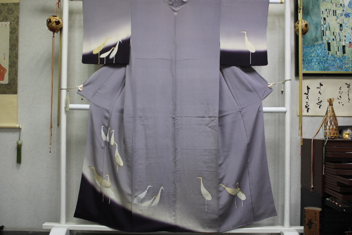 > きもの今昔9011 付け下げ訪問着 広衿袷手縫い仕立 正絹一越ちりめん生地 フジグレー色地裾紫ボカシ柄 身丈153cm