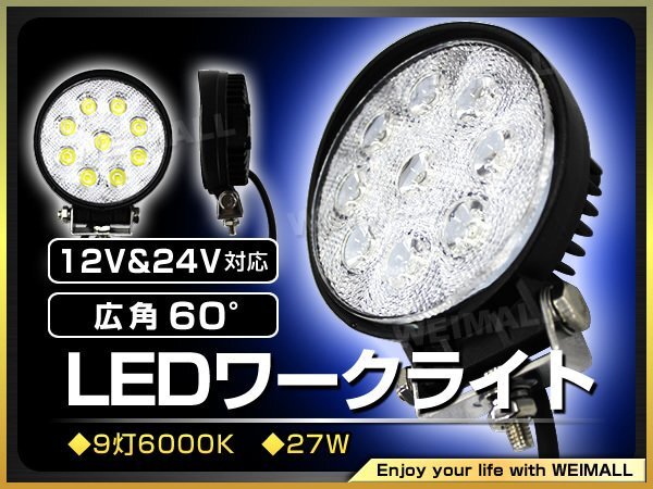 - LEDワークライト 27W 12V 24V対応 防水 防塵 9連 ランプ 6000K 白 軽トラ トラック 荷台灯 LED作業灯 サーチライト 丸型 汎用 アウトドア