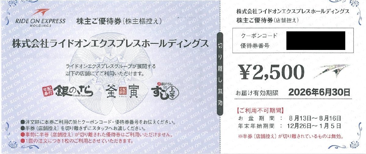 > 甲南☆【5,000円分(2,500円×2枚)】ライドオンエクスプレスホールディングス☆株主優待券☆銀のさら 釜寅 すし上等☆2026.6.30【管理7089】