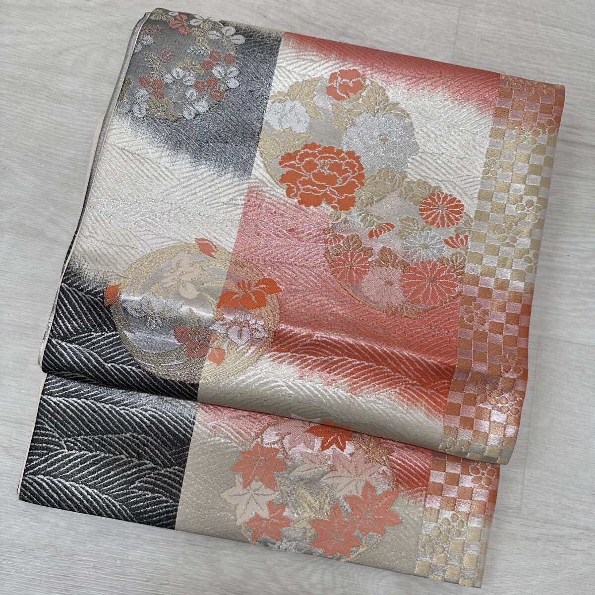 > 袋帯 花輪の織出し 変わり市松のグラデーション 正絹 着物 W-4451