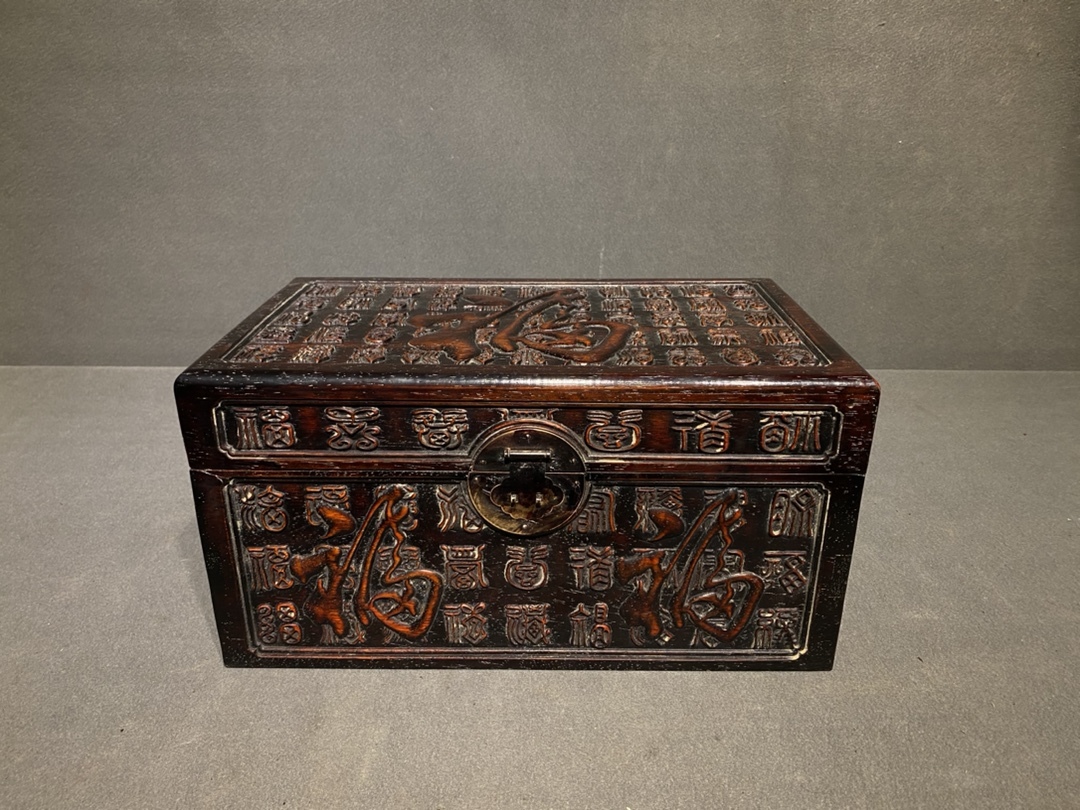 - 早期收集 旧藏 古紫檀木彫 百福字 百宝箱 收納箱 盒 浮彫 賞物 極細工 古賞物 東洋彫刻 旧家蔵出し 中国唐物 時代物 骨董 中国古美術