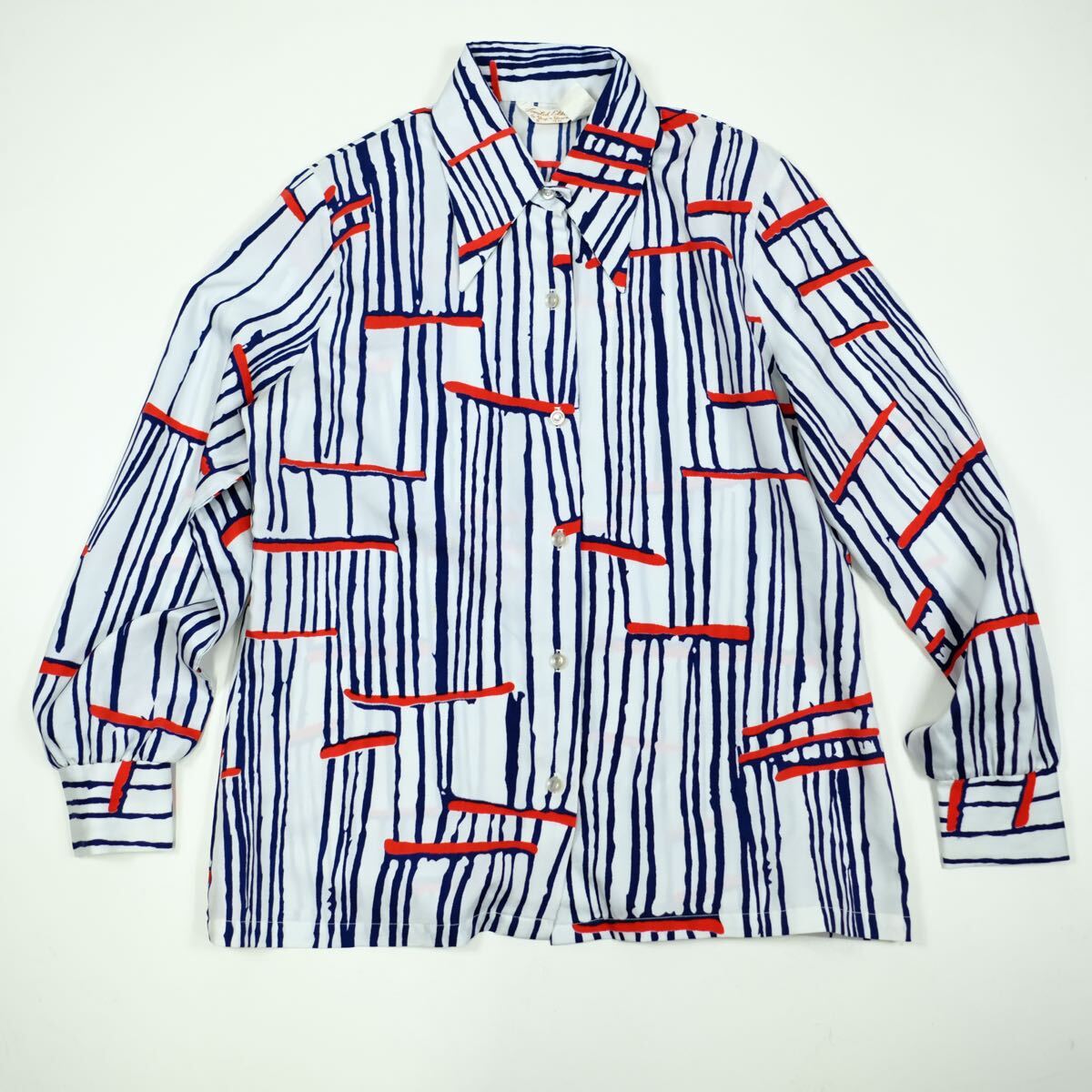 - 1970s USA製 ビンテージ 総柄デザインシャツ ヒッピー ポリシャツ アート 古着屋 ヴィンテージ 長袖シャツ ストライプ