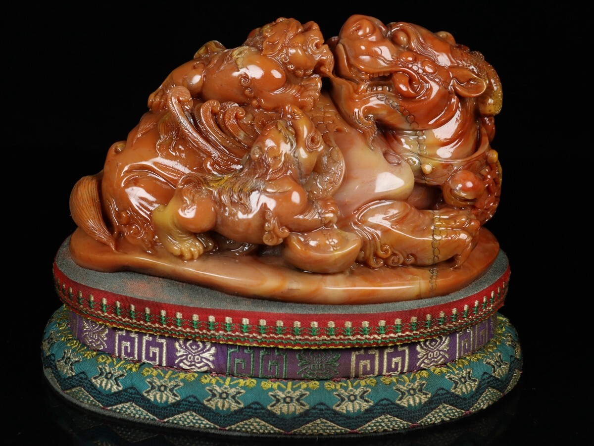 - 「清 玉セン作 老寿山石 田黄石彫り 瑞獣 擺件」極細工 擺件 古賞物 中国古美術 旧蔵出