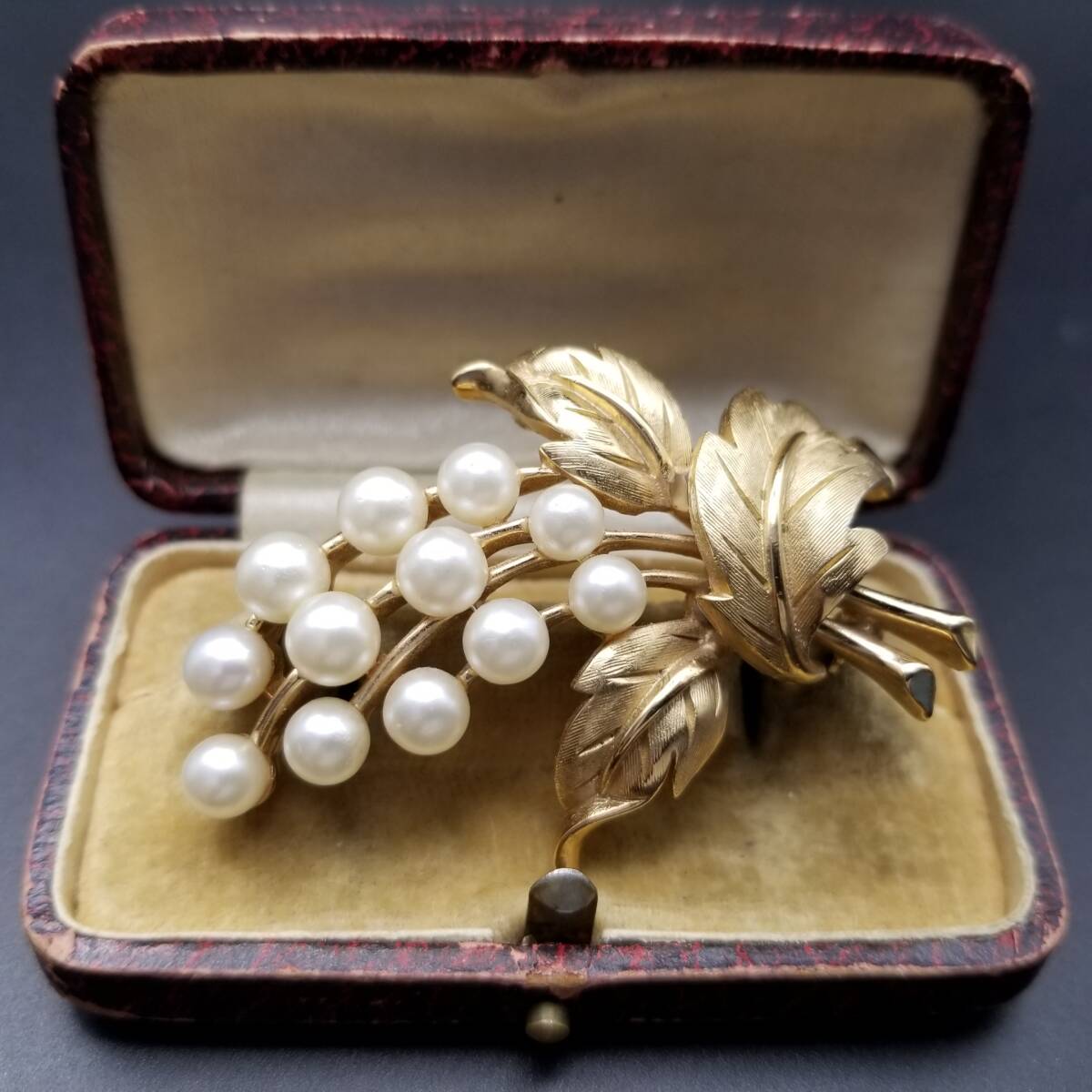 - 50'60's Crown Trifari パールの葉 ヴィンテージ リーフ ブローチ レトロ エレガント ゴールドトーン 大ぶり 存在感 フォーマール Y24-V