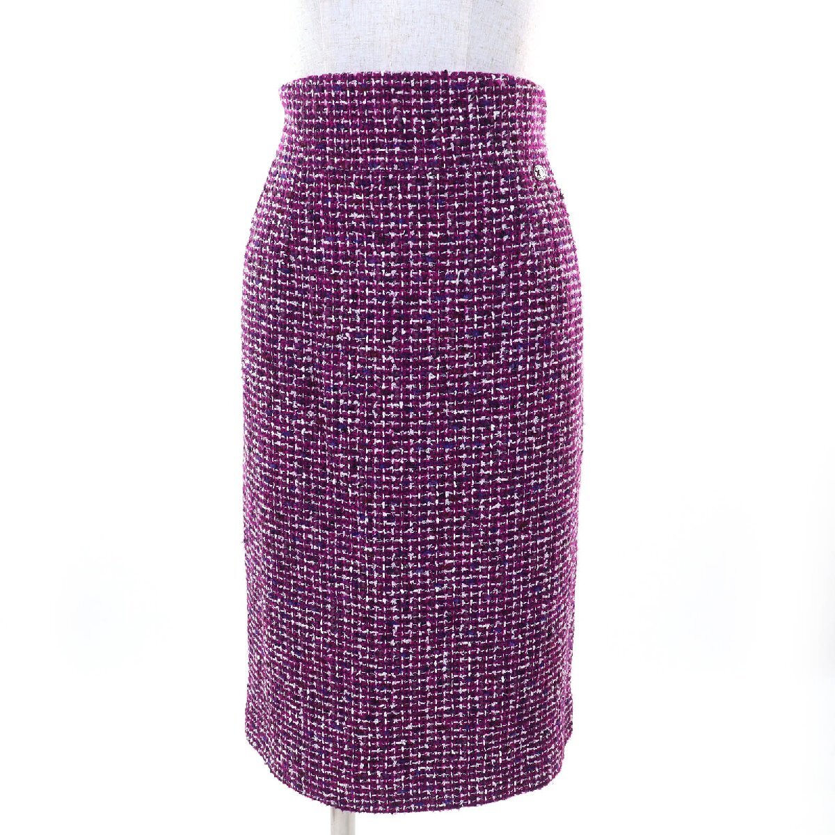 > 美品△CHANEL シャネル 09P P35515 ココマークプレート コットンツイード タイトスカート パープル系 44 フランス製 レディース