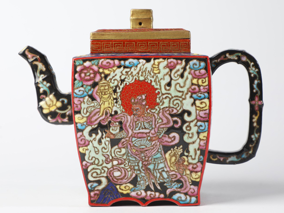 - ◆御泓軒◆『清時代 乾隆御製底款 琺瑯彩仏像紋茶壺 共箱 宜興紫砂 常滑 朱泥急須 煎茶道具 茶壷』極細工・古賞物・中国古玩・中国古美術