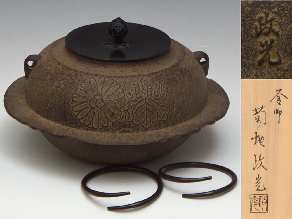 - 釜師 菊池政光(造)菊桐羽根付 置炉釜 共箱 釜鐶 茶道具 金属工芸 茶釜 茶湯釜 鉄釜 美品 u1129o