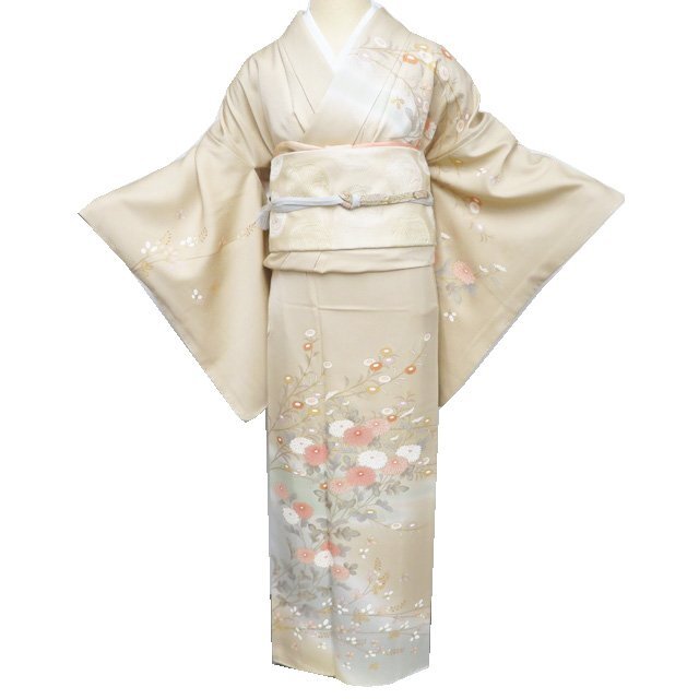 > 訪問着 着物 未使用 正絹 袷 フォーマル 花の図 秋草 反端付き 薄香色 多色 金 身丈166cm 裄66.5cm L トール きもの北條 A1277-14
