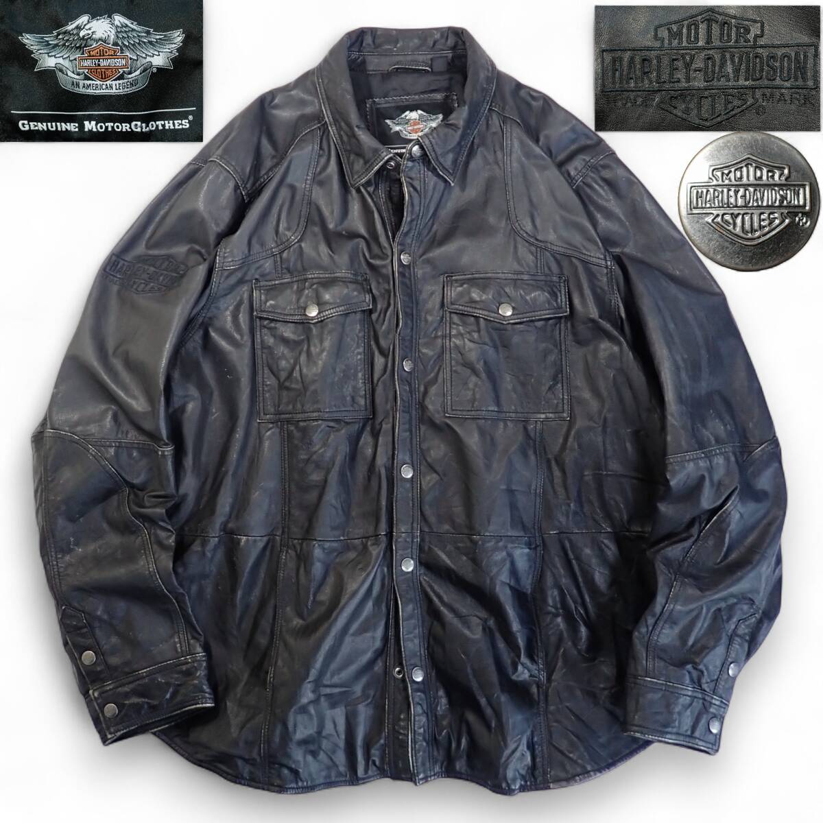 - 7091/HARLEY DAVIDSON 山羊革シャツジャケットXL●ロゴ刺繍メタルスナップボタンGOAT SKIN本革レザー ハーレーダビッドソンMOTORCYCLES古着