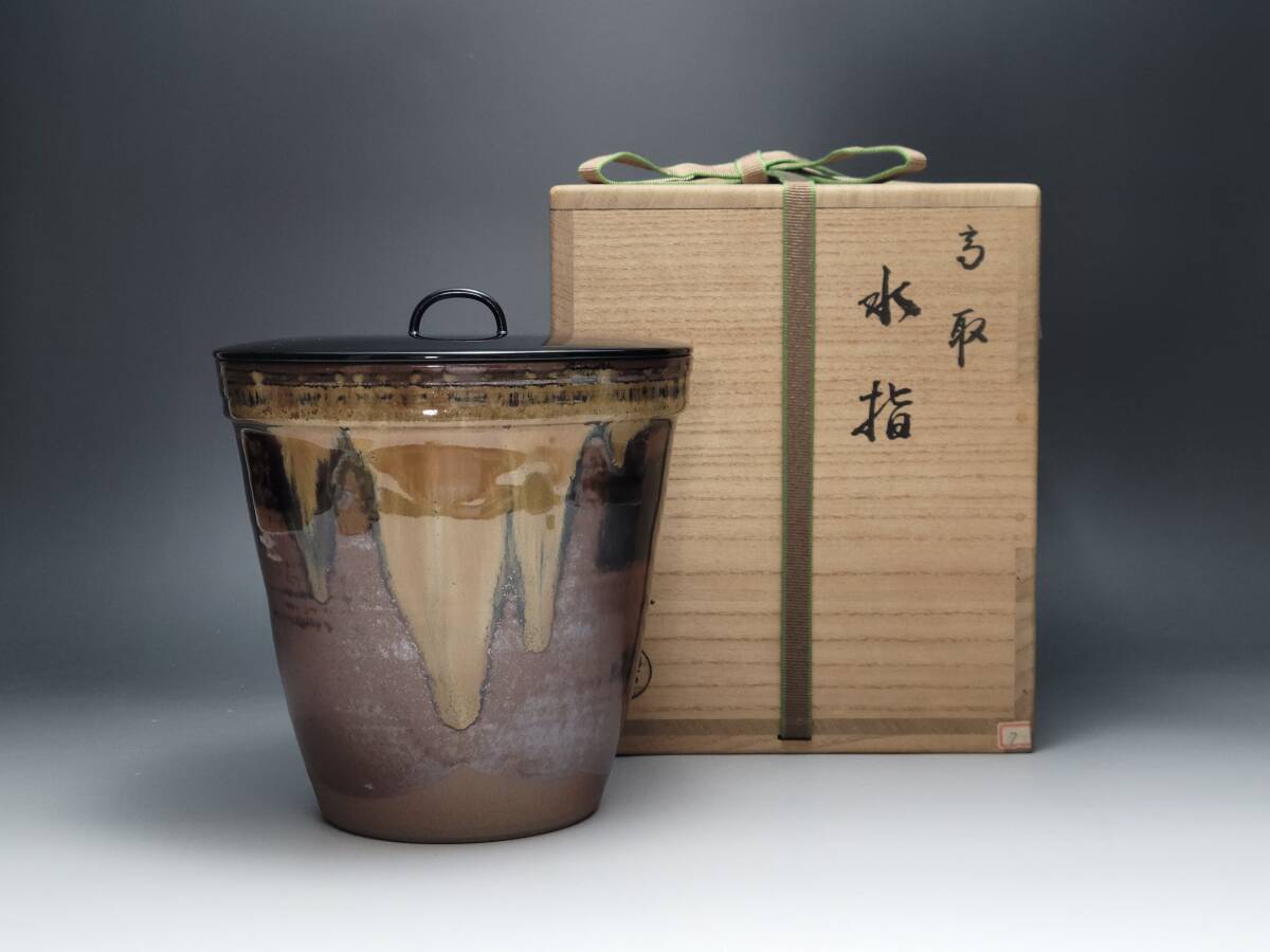- ● 高さ 約 18cm 光沢に優れた釉薬の変化が風情のある美しい 高取焼窯元 雪山窯 鬼丸碧山作 水指 共箱・茶碗 茶道具 煎茶道具 茶器 ●