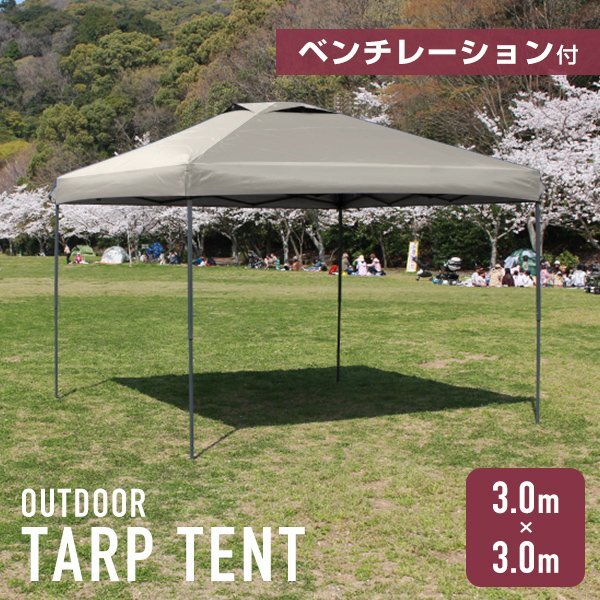 > タープテント 3m ベンチレーション 撥水加工 収納ケース付 軽量 スチールフレーム UVカット 日除け アウトドア キャンプ BBQ ベージュ