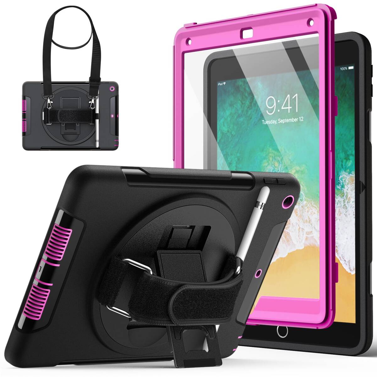 - 360°回転ハンドストラップスタンド 保護耐衝撃頑丈なタブレットカバー 液晶保護フィルム付き (プラム) (第6/5世代、2018