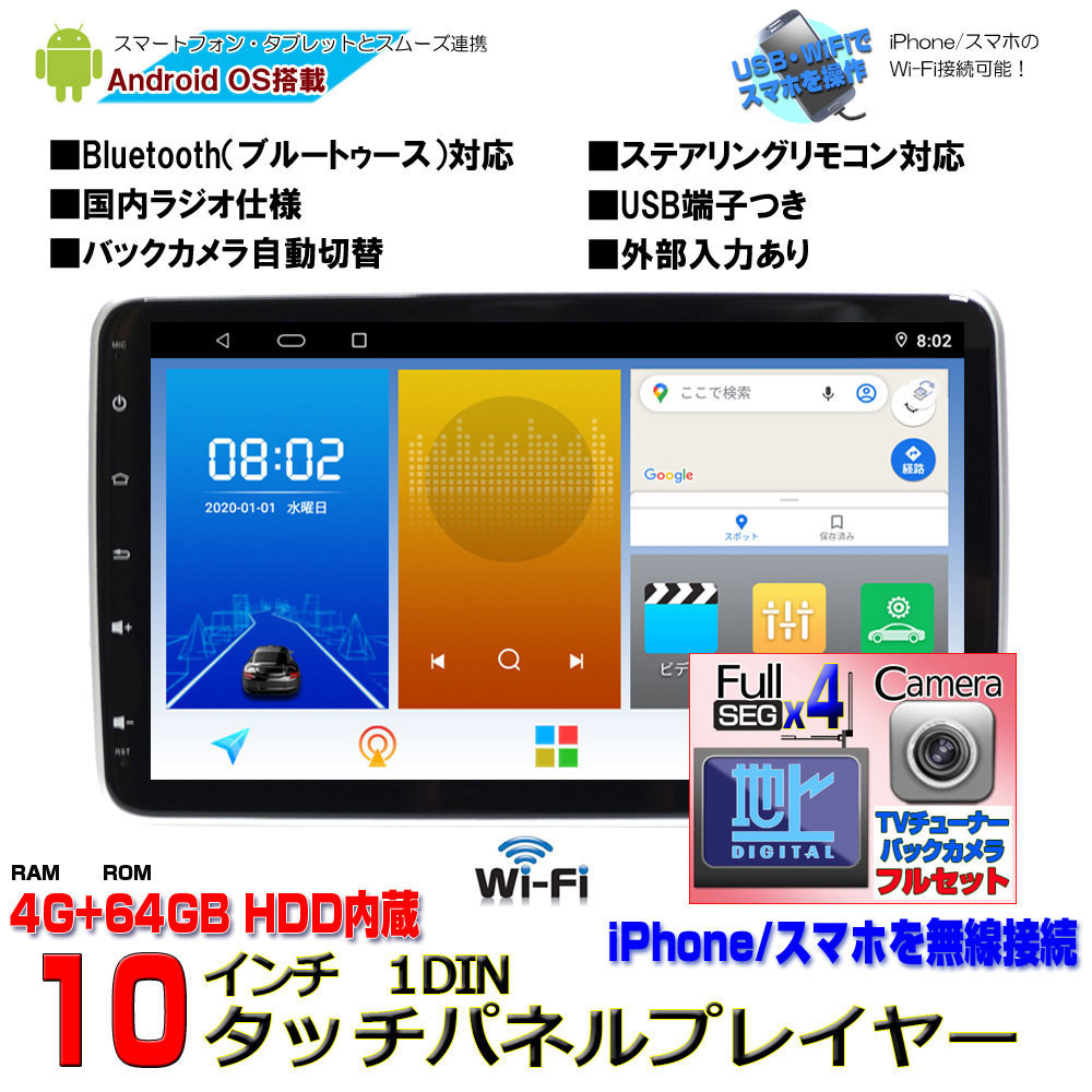 > 瞬間起動 画面分割 アプリー記憶 カーナビ1DIN10インチタッチパネルAndroid10 4GB+64GB+地デジ4x4フルセグチューナー+170度バックカメラ