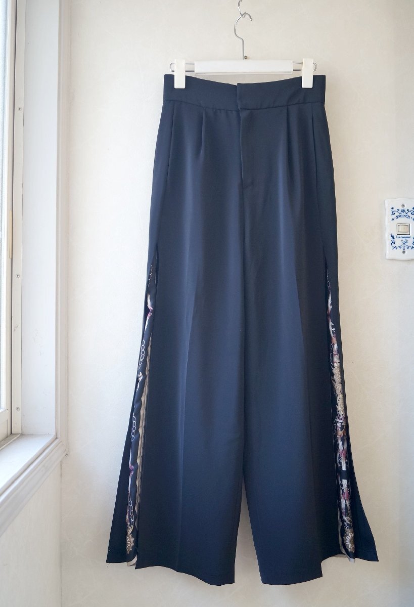 両サイドに大胆にスリットを入れ、スカーフ柄を覗かせたデザインパンツ。