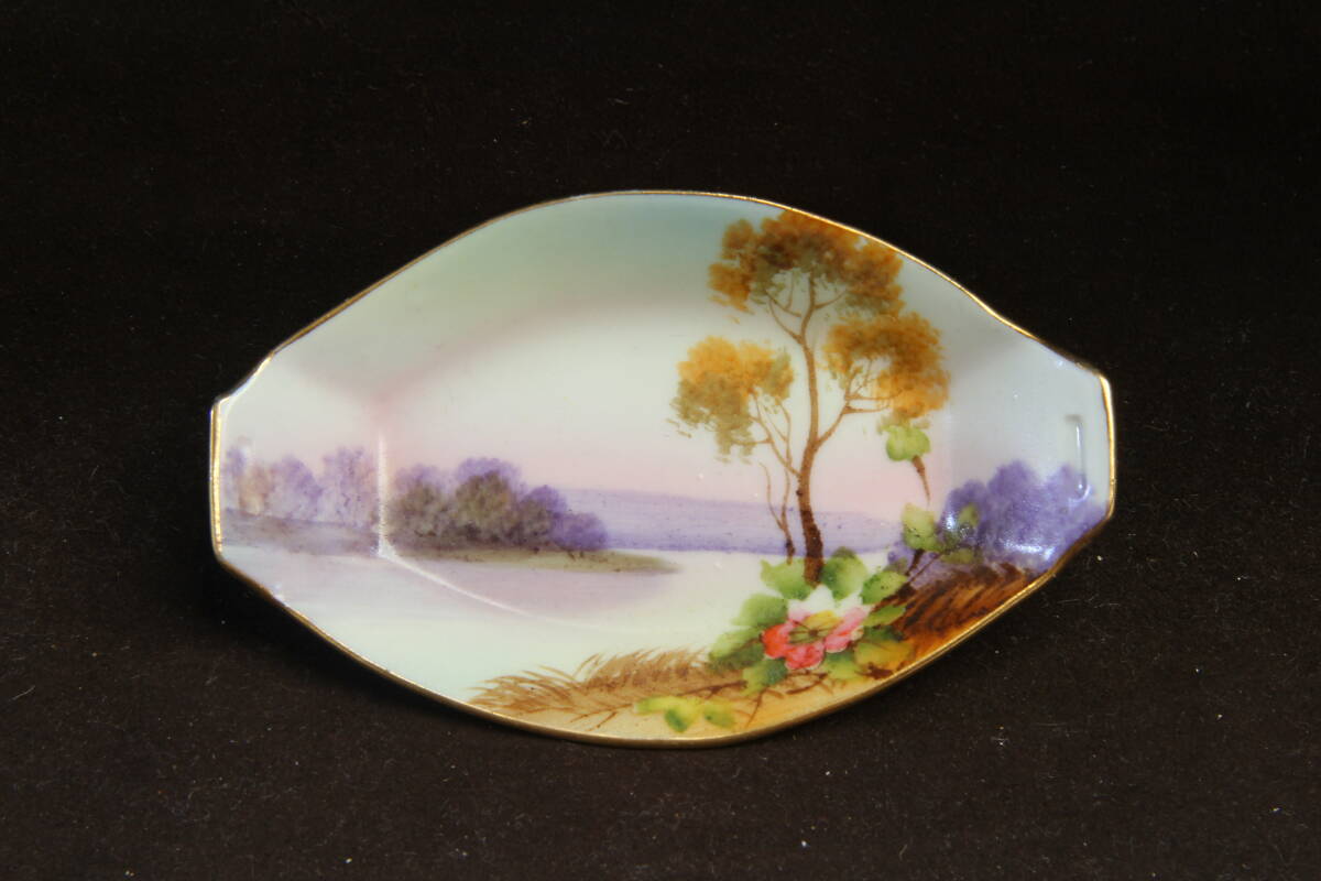 - 3448e オールドノリタケ セロリディツシュの小皿 M-NIPPON 明治 金彩で縁取り 、湖畔の春の風景を描いたディッシュ