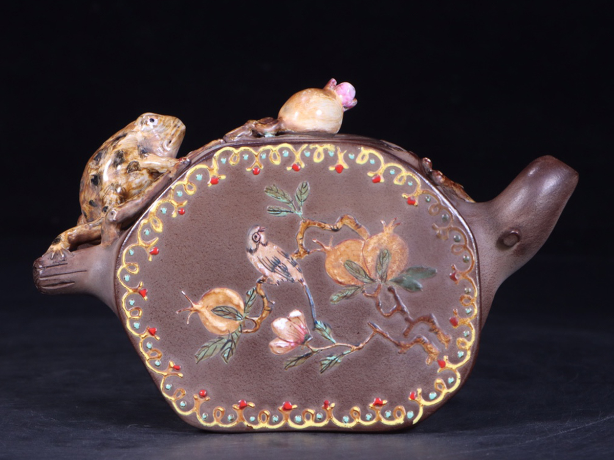 - ◆御泓軒◆『清時代 鳴遠銘 施彩 石榴蟾紋倣生型茶壺 宜興紫砂 常滑 朱泥急須 煎茶道具 茶壷』極細工・古賞物・中国古玩・中国古美術