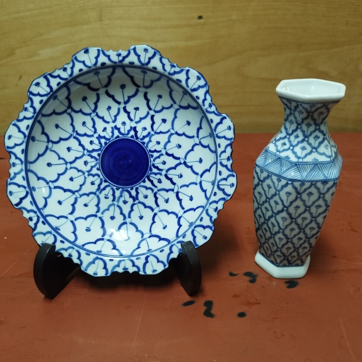 - 戸05d ブルー&ホワイト タイ パイナップル柄 食器 花瓶 セット まとめ売り Made in Thailand
