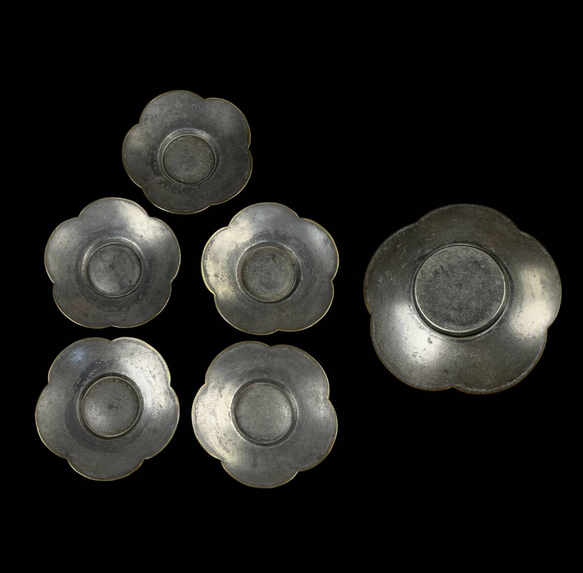 - 【偲】錫製 古錫 茶托 梅型 5客 重約511g 直径約10㌢ 煎茶道具 瓶座 茶器 托子 茶道具 金属工芸. g-17
