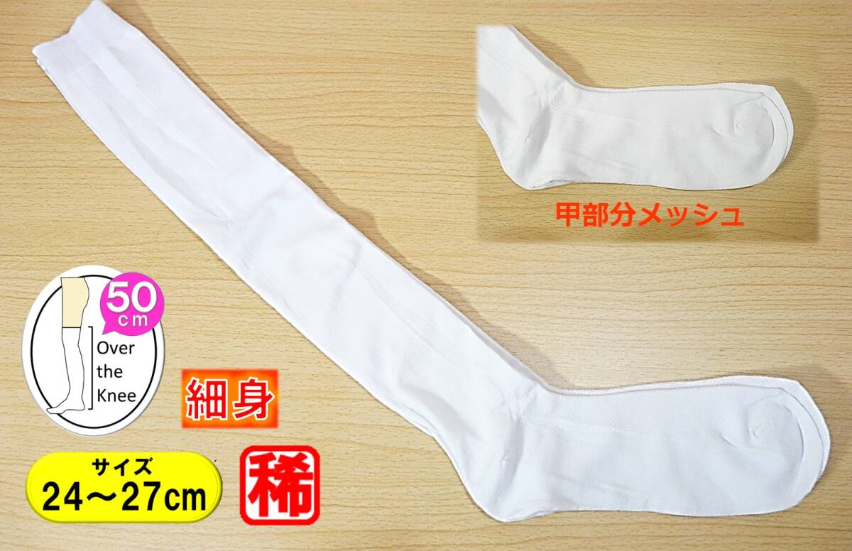 - 【レッグウェア★未使用品】平編み ロング丈 細身◆白 ニーハイソックス◆フット部メッシュ◆オーバーニー◆24-27cm◆50cm丈◆稀少◆
