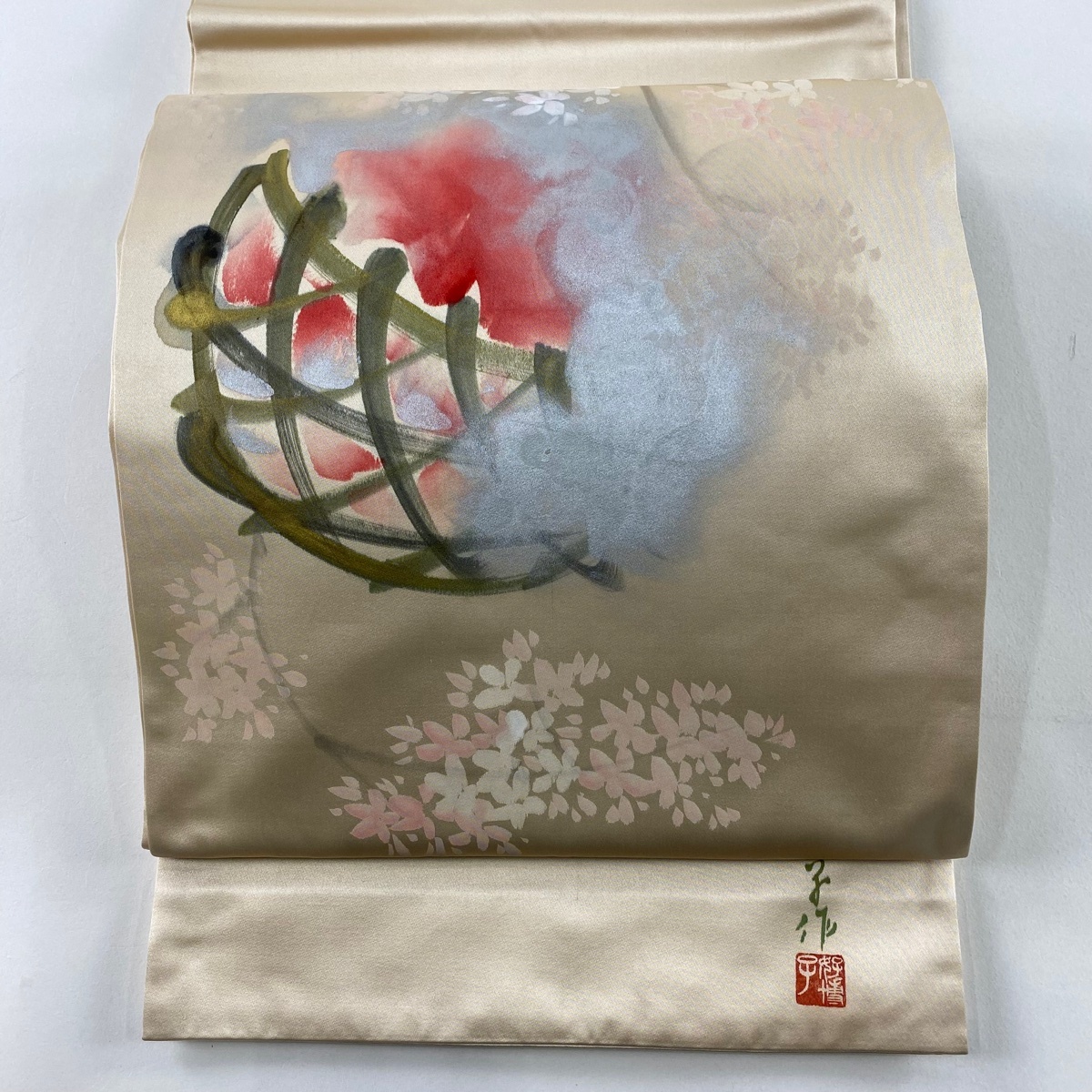 - 袋帯 秀品 落款 花籠 枝花 金銀彩 ぼかし ベージュ お太鼓柄 正絹 【中古】