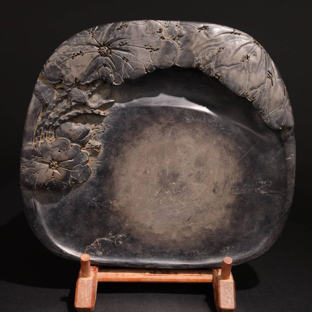 - ▽鴻▽清朝時代 端硯 荷鶴隠韻紋端渓硯 馬大士銘 唐硯 墨寶 書道具 時代物 中国古美術 骨董品
