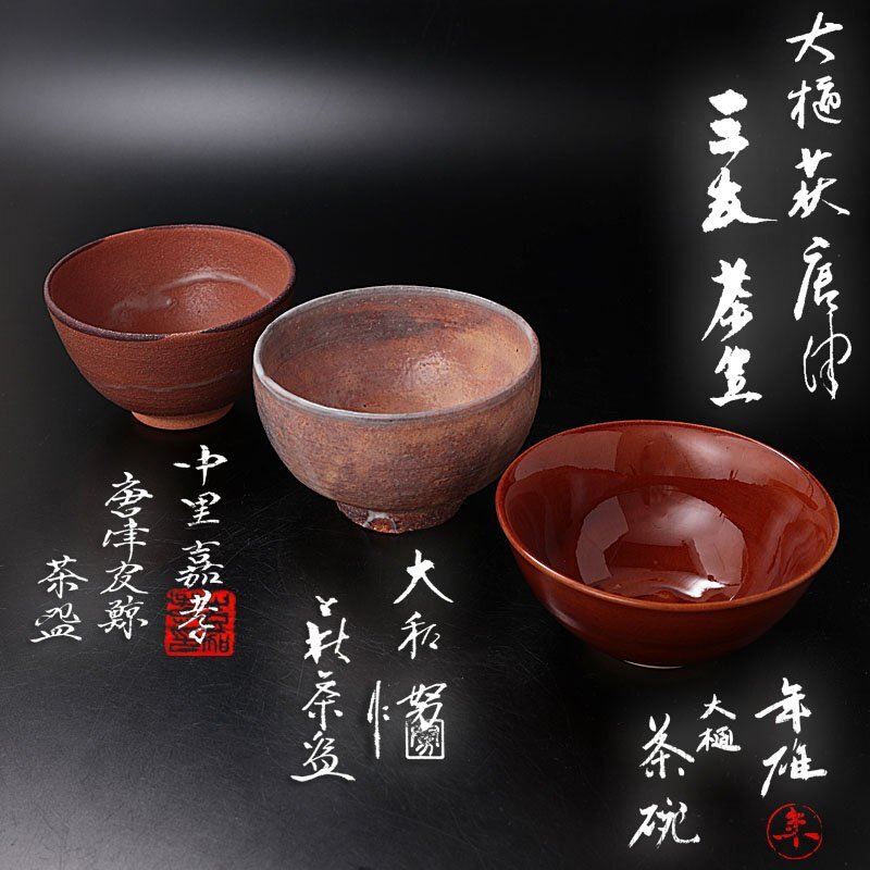 > 【古美味】大樋・萩・唐津 三共茶碗(中里嘉孝、大和努、大樋年雄) 茶道具 保証品 SwN9