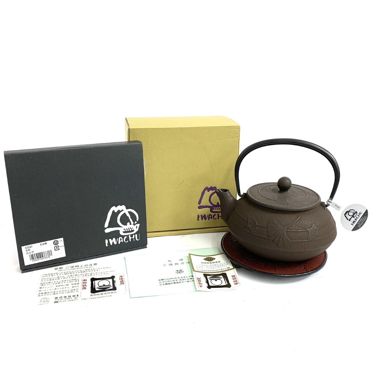 - 未使用品◆岩鋳 Iwachu 南部鉄器急須5型銀杏こげ茶0.65L 南部鉄器/釜敷カエデ/えび茶/セット ブラウン