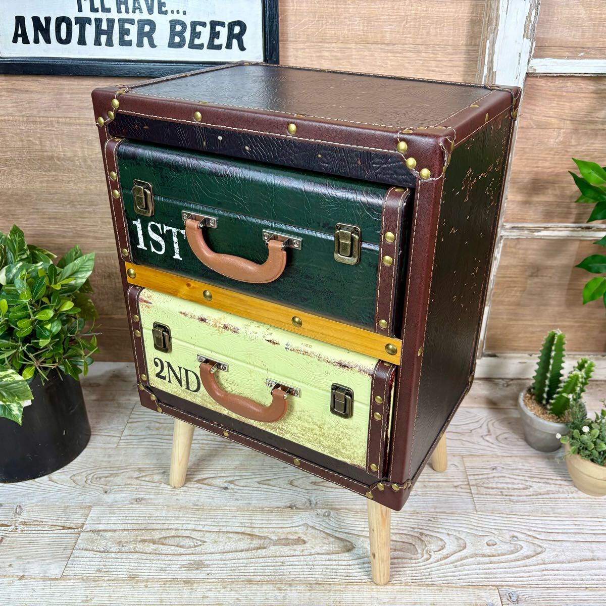 - アンティーク調レザートランクチェスト二段脚付(41㎝×60㎝)木製飾り棚 アンティーク ビンテージ調 洋タンス収納家具 レール付引き出し