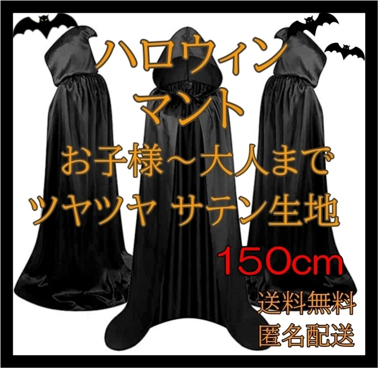 - ハロウィン マント 黒 サテン生地 子供 大人 150㎝ フード付き