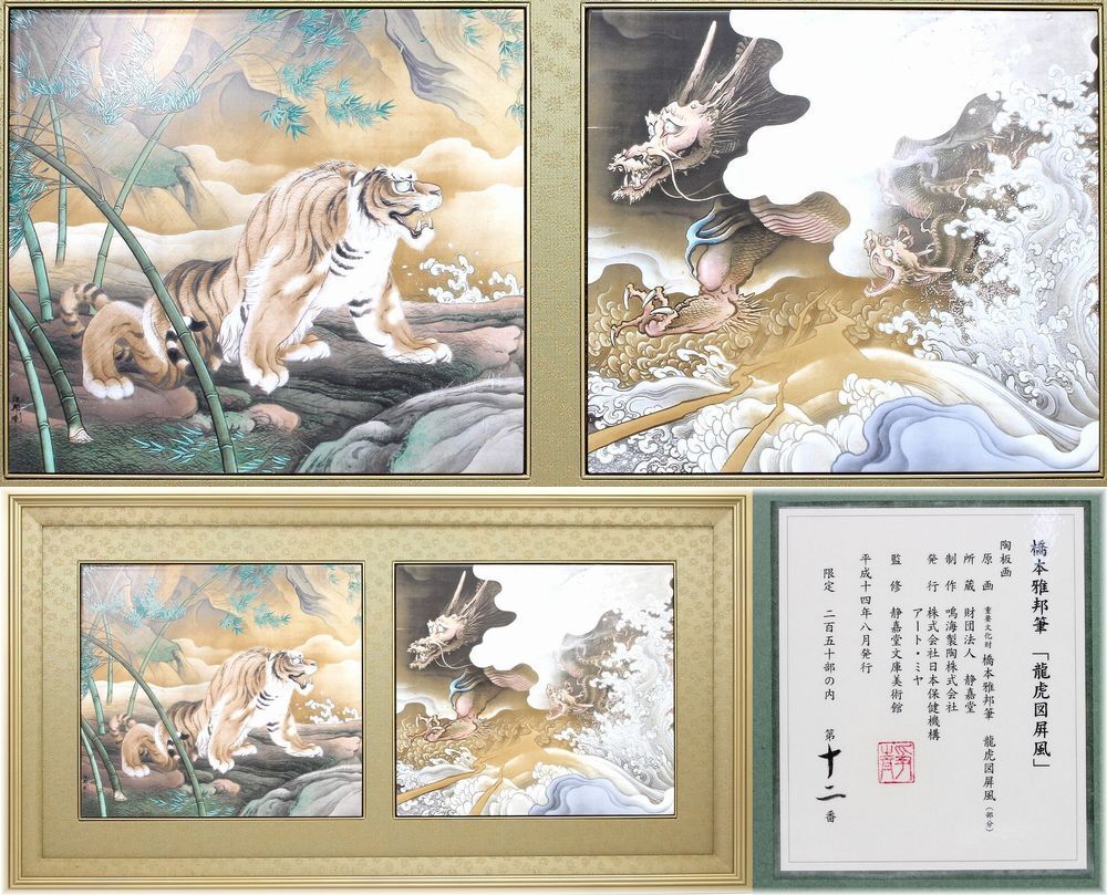 > 【真作】 橋本雅邦「龍虎図屏風」陶板画 鳴海製陶 2002年(平成14年)作 額装 限定250部の内12番 証明シール 保証書付き タトウ箱 美術陶板画