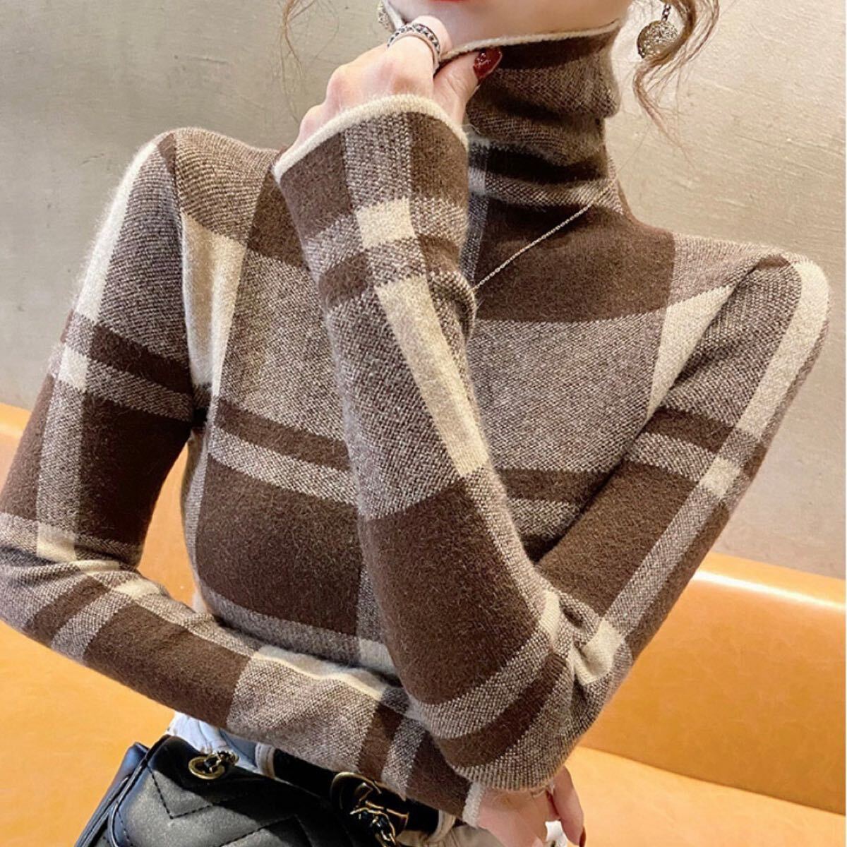 - 新品!ラスト3点!チェック柄 タートルネックトップス ブラウン セーター ハイネック ニット