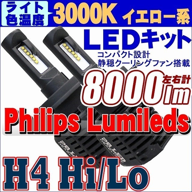 > 【3000K】フィリップスLEDキット 8000lm(左右計) H4 Hi/Lo 静音省スペースファン ヘッドライト フォグランプ 12V/24V