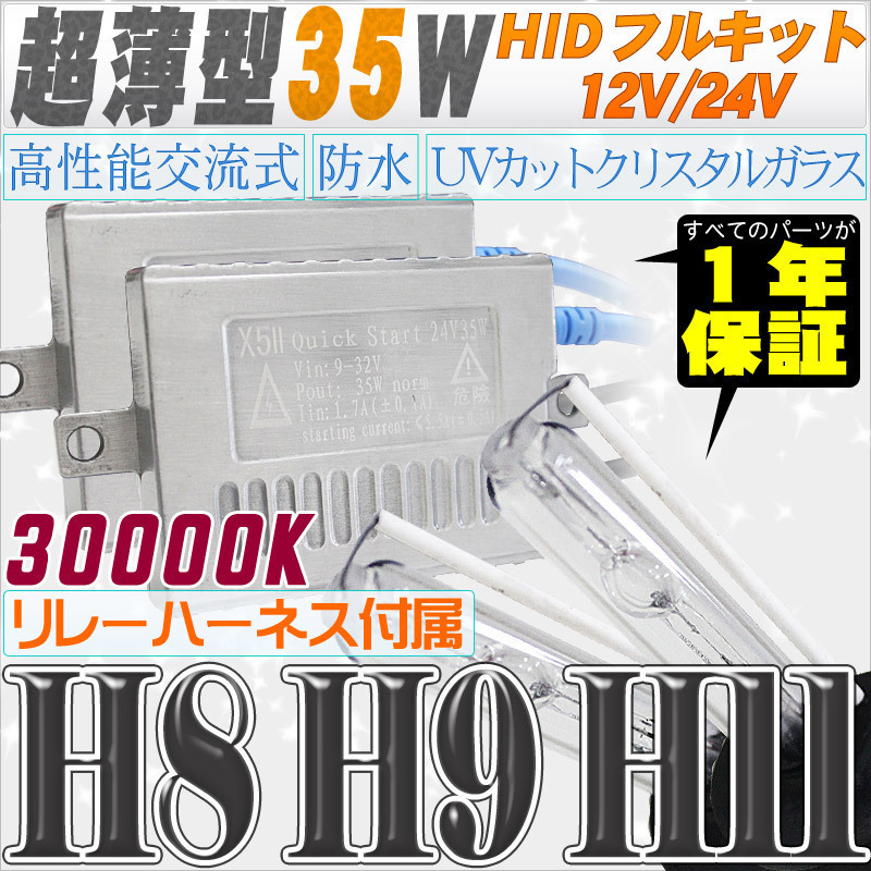- 高性能 薄型HIDキット 35W H11/H8 リレー付 30000K 12V/24V 【交流式バラスト&クリスタルガラスバーナー】