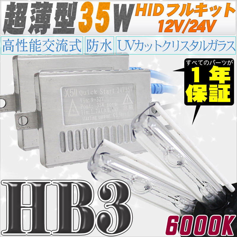 - 高性能 薄型HIDキット 35W HB3 6000K 12V/24V 【交流式バラスト&クリスタルガラスバーナー】
