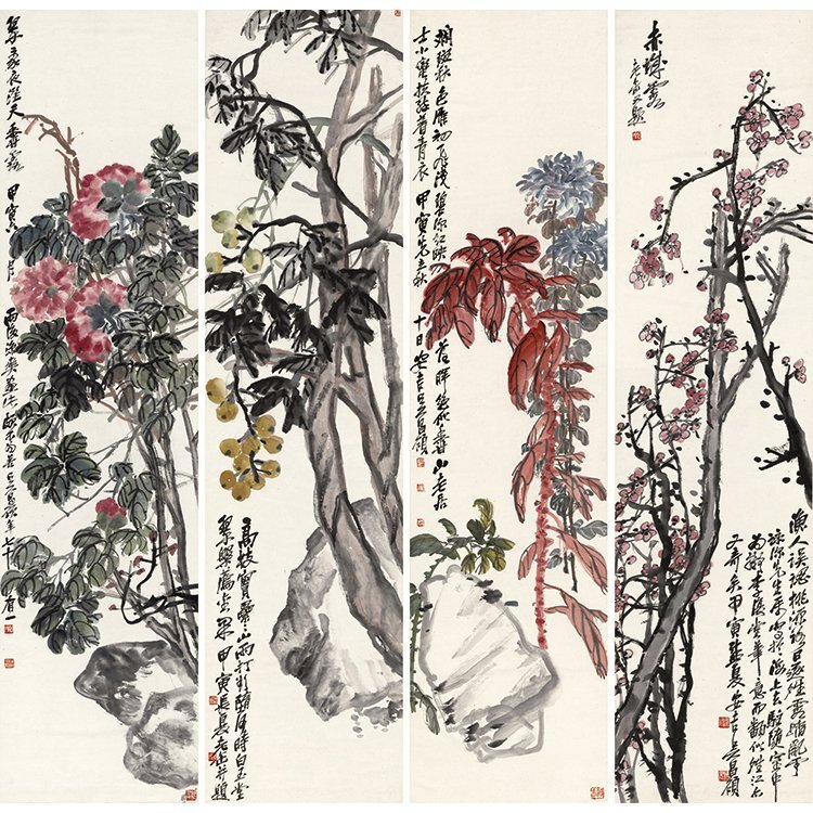 - 店長勧め 送料込み 極美品 ! 中国美術 呉昌碩 4枚セット 表装なし 画仙紙 画芯 静物画 花絵柄 鑑賞 装飾 印刷 zh730