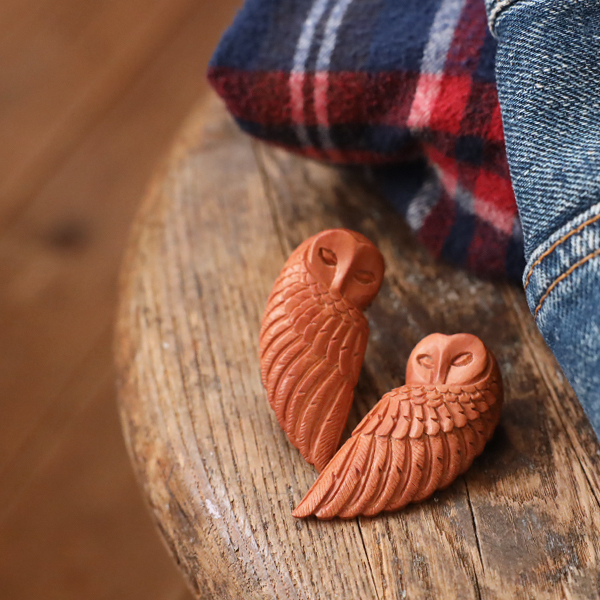 - 新作 2個セット ブローチ 手彫り ウッド カービング 天然木 フクロウ モチーフ サウォウッド ペア ハート Q15A