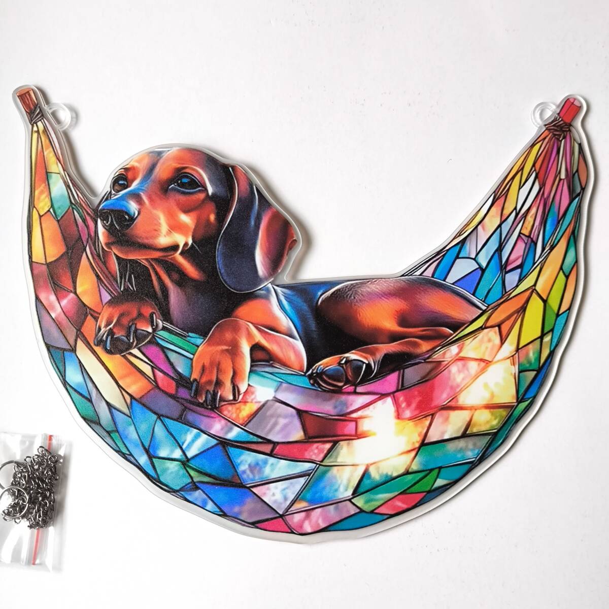 - 【ハンモックと犬】アクリルプレート 飾り サンキャッチャー チェーン付き オブジェ お洒落 壁や窓辺の飾りに◎◎