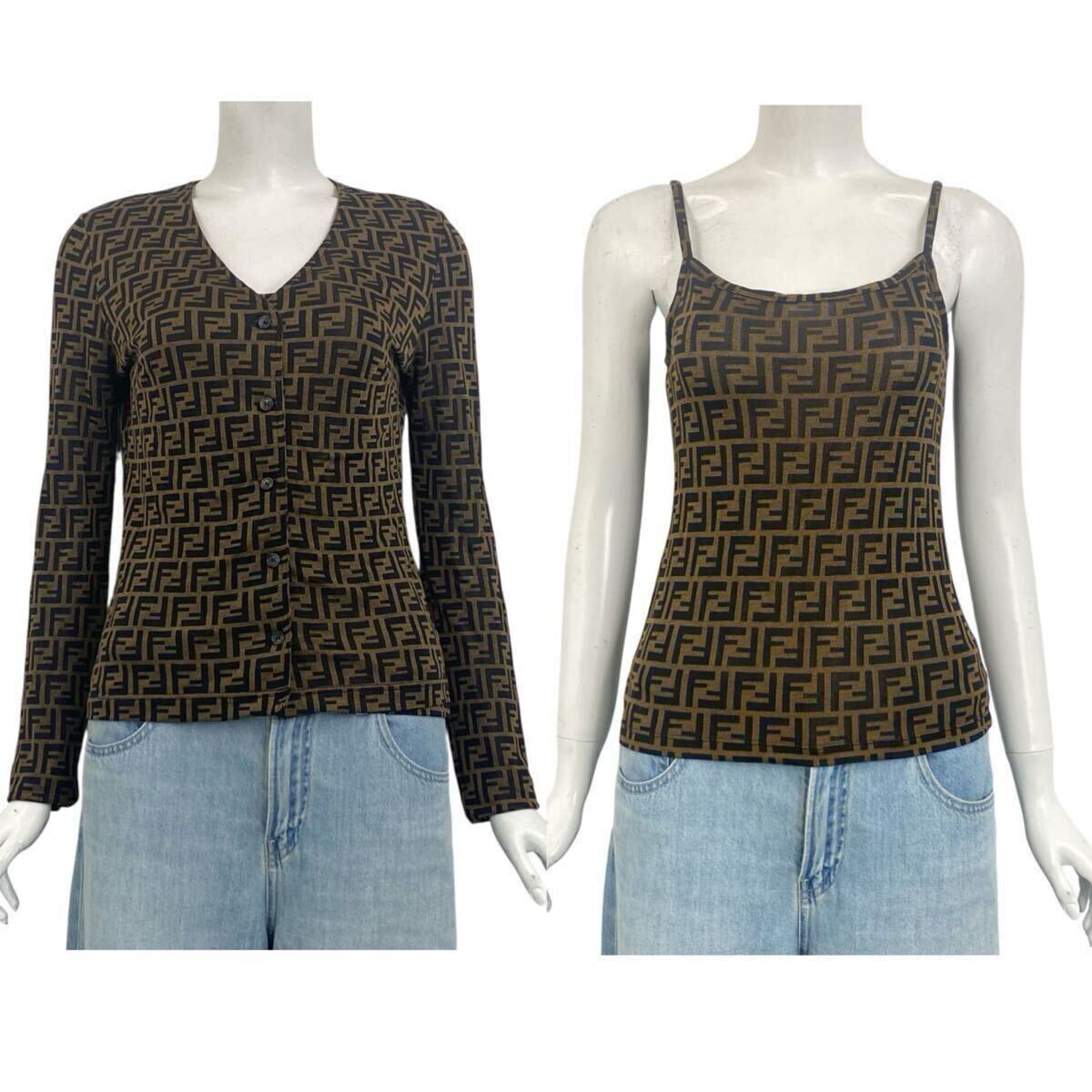 - 美品 FENDI フェンディ アンサンブル カーディガン キャミソール FF柄 ロゴ ブラウン サイズ42 AH5-4 1002-7