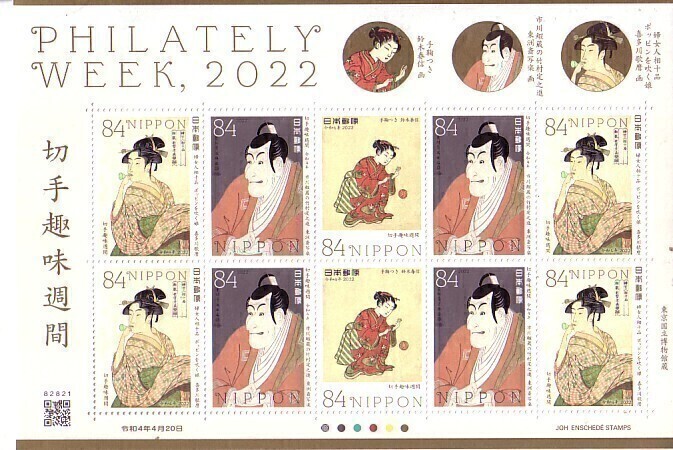 - 「切手趣味週間2022 喜多川歌麿・ポッピンを吹く娘 東洲斎写楽・市川鰕蔵の竹村定之進 鈴木春信・手毬つき」の記念切手です