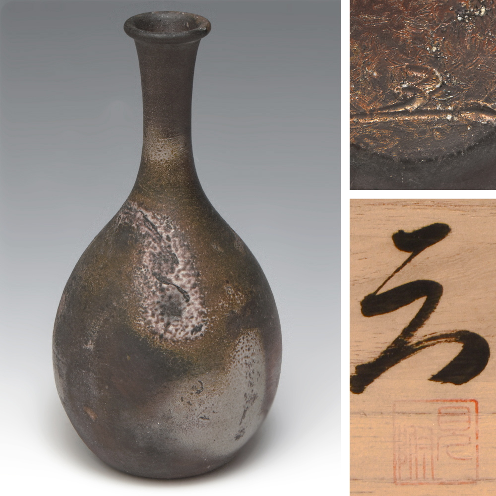 > 見附文雄 (造) 備前 鶴首花入 共箱 共布 しおり 茶道具 華道具 花器 花瓶 花生 陶磁器 備前焼 u1178a