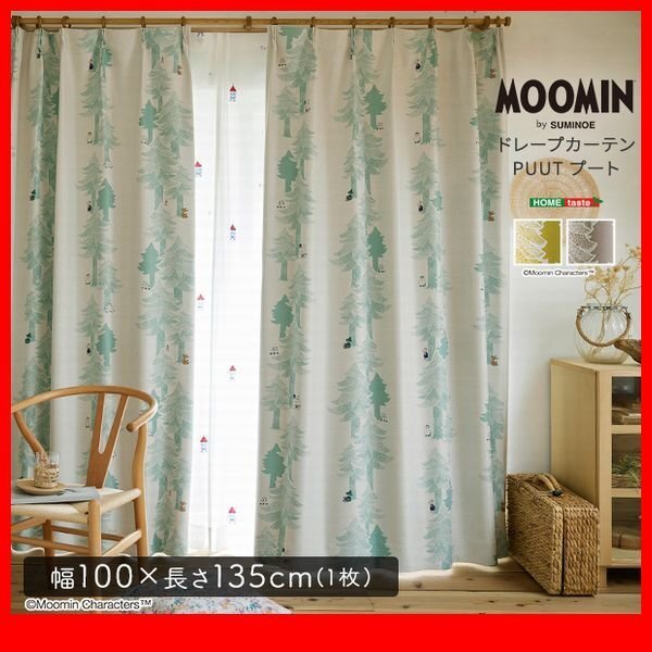 - カーテン★新品/MOOMIN ムーミン ドレープカーテン 100×135cm 1枚/遮光 洗濯機可 形状記憶加工 安心安全の日本製/緑 茶 黄/zz
