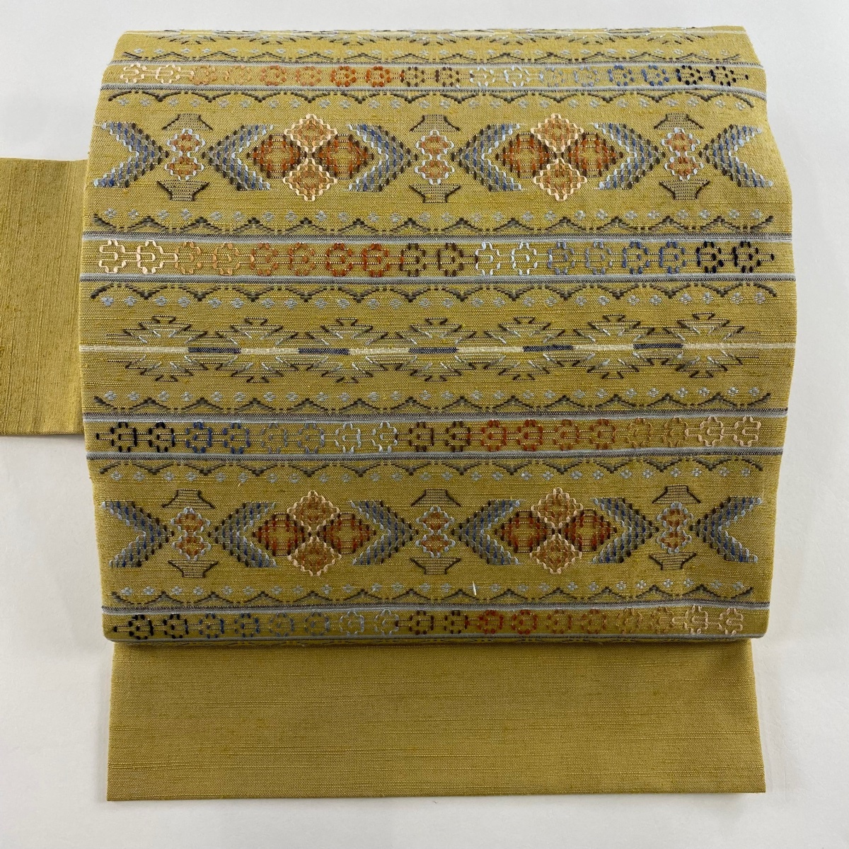 - 名古屋帯 美品 逸品 紬地 幾何学模様 横段 花織 黄土色 正絹 【中古】