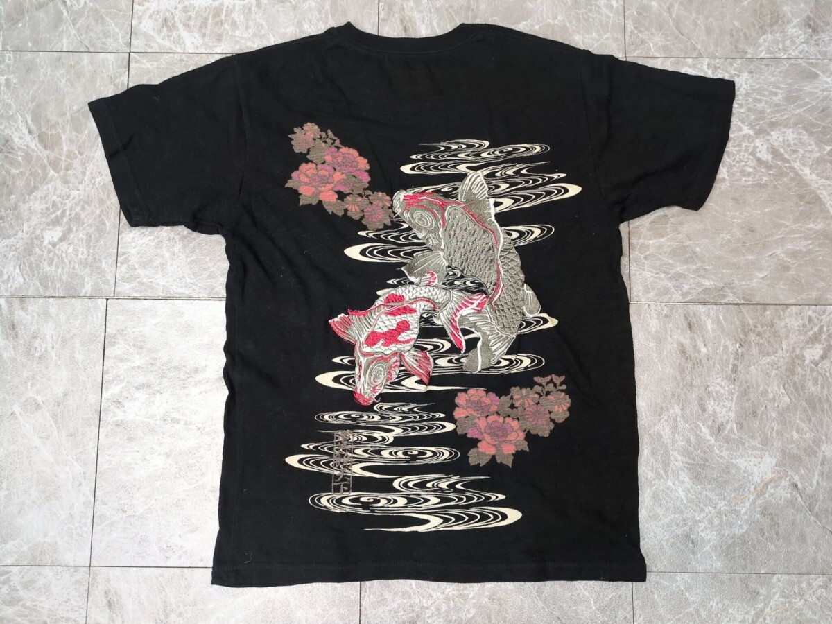 - 2. 和柄 Y2K 粋 意匠 豊穣天下 多段デザイン 多重ポケット カットソー 錦鯉 牡丹 流水波紋 半袖Tシャツ サイズ弐 黒グレー白赤 x307