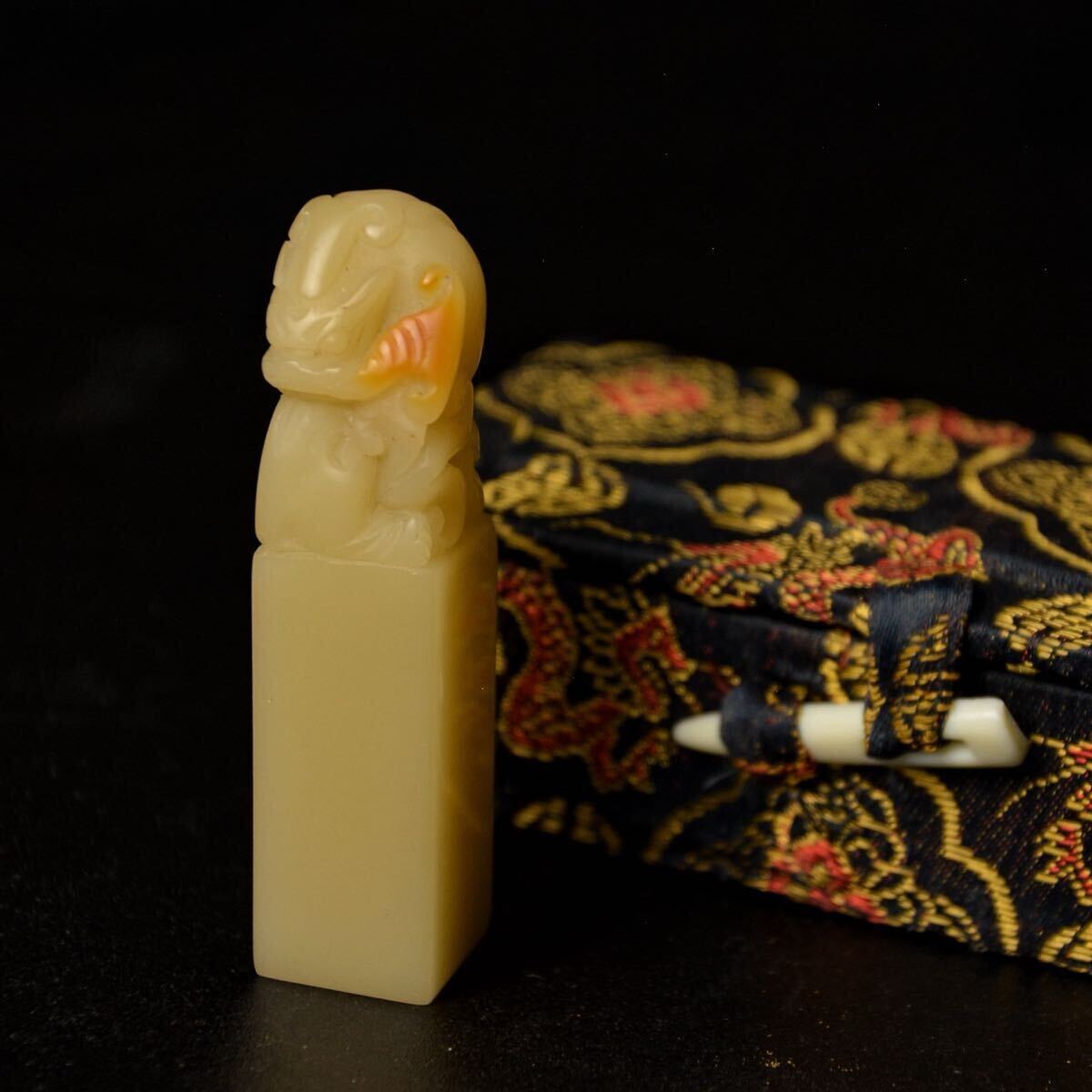 - 小舫 篆刻 寿山石 龍 竜 文洋 芙蓉 1980年代 印材 箱付 時代物 検:篆書 彫刻 印鑑 印章 書道 中国美術 古美術 文房四宝 田黄石 鶏血 b0268